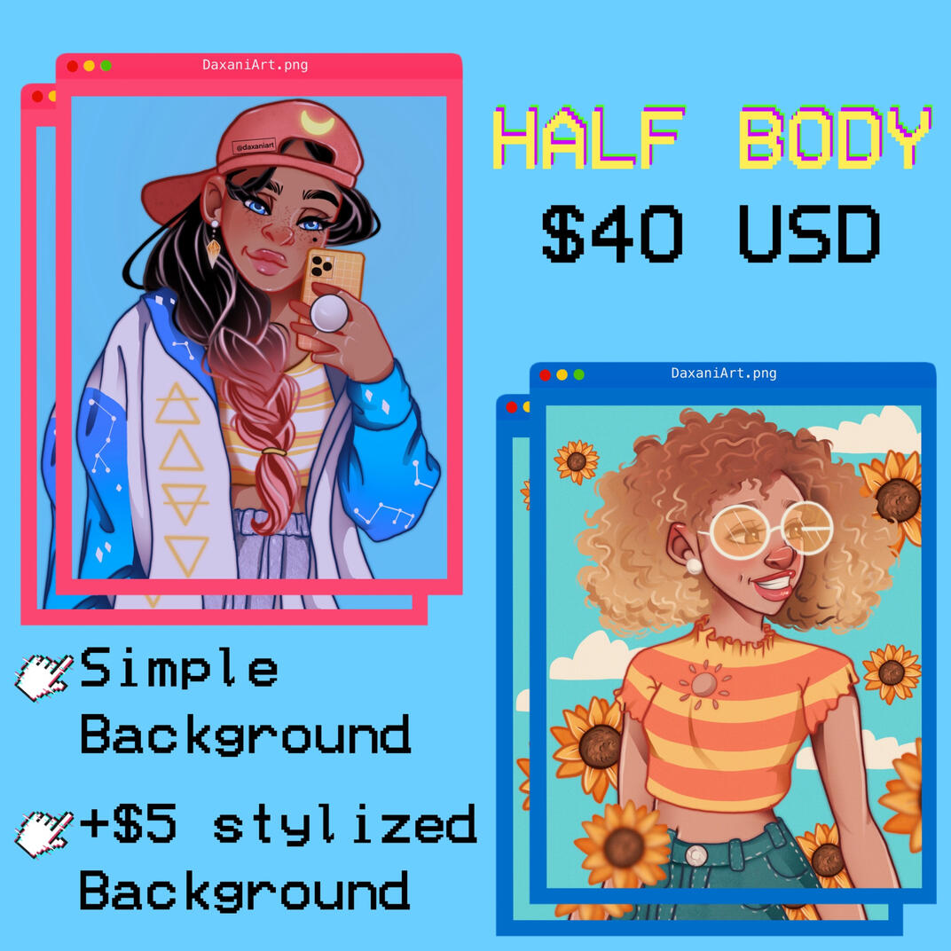 Send me few references of how you'd like to be drawn and a detailed description. Whatever reference photos you send, make sure the head isn't cut off and at least one without a filter; I need a good visual of whom I'm drawing.